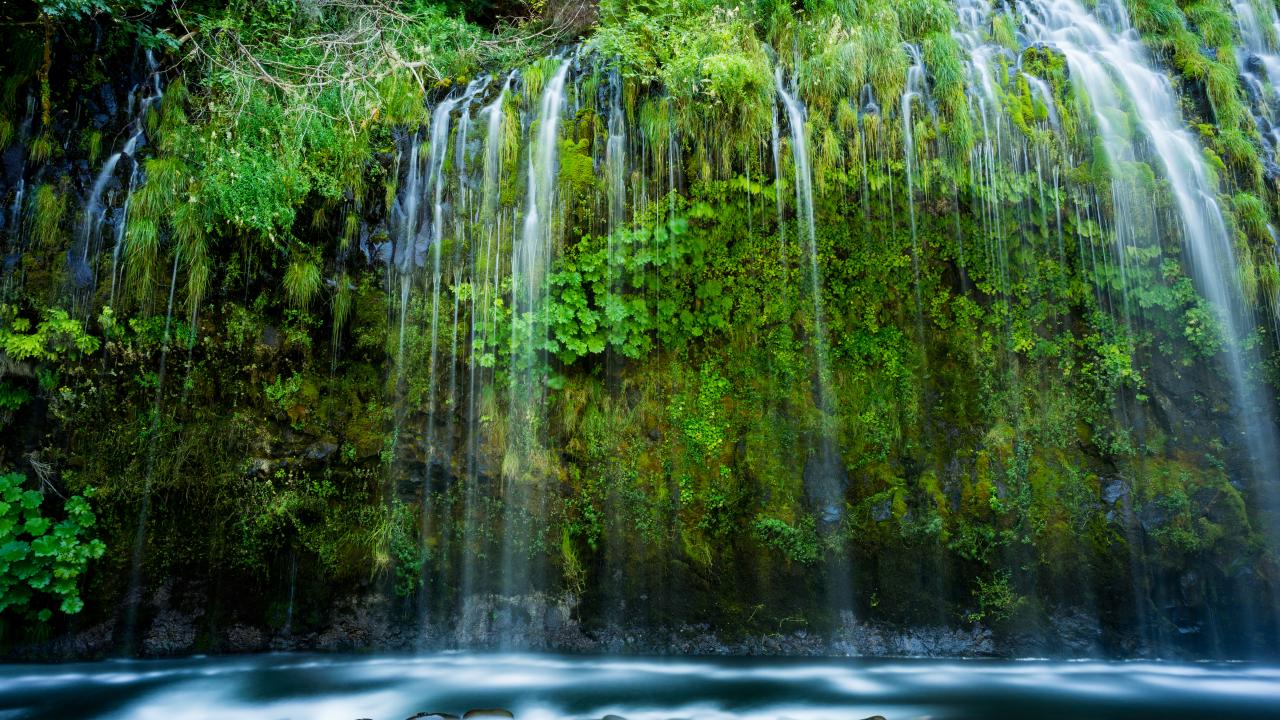 Wallpaper A beautiful waterfall flows down a green cliff