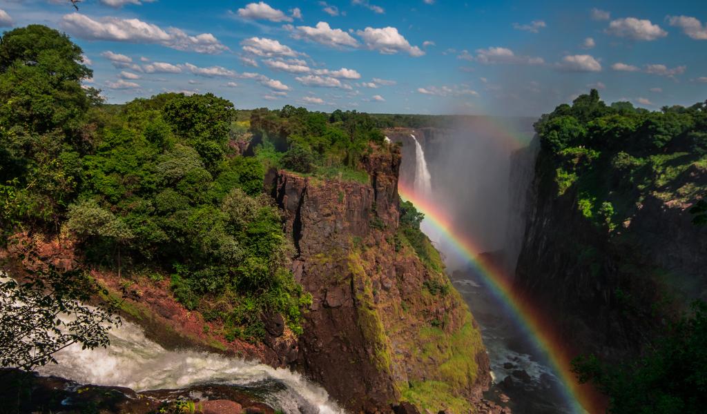 Wallpaper Beautiful waterfall drains from a cliff under a blue sky