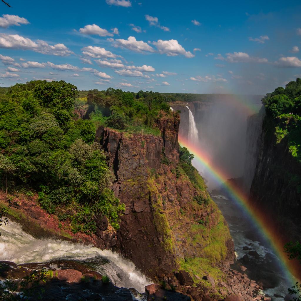 Wallpaper Beautiful waterfall drains from a cliff under a blue sky