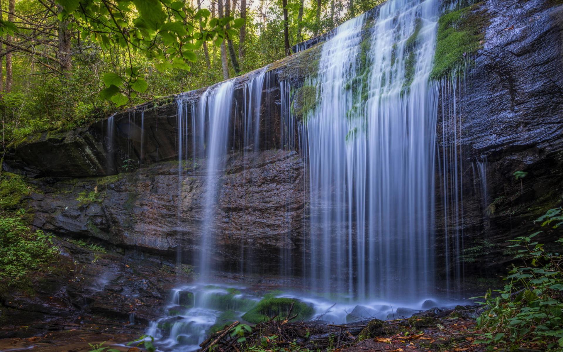 Wallpaper Cold water of a waterfall flows down a wet rock