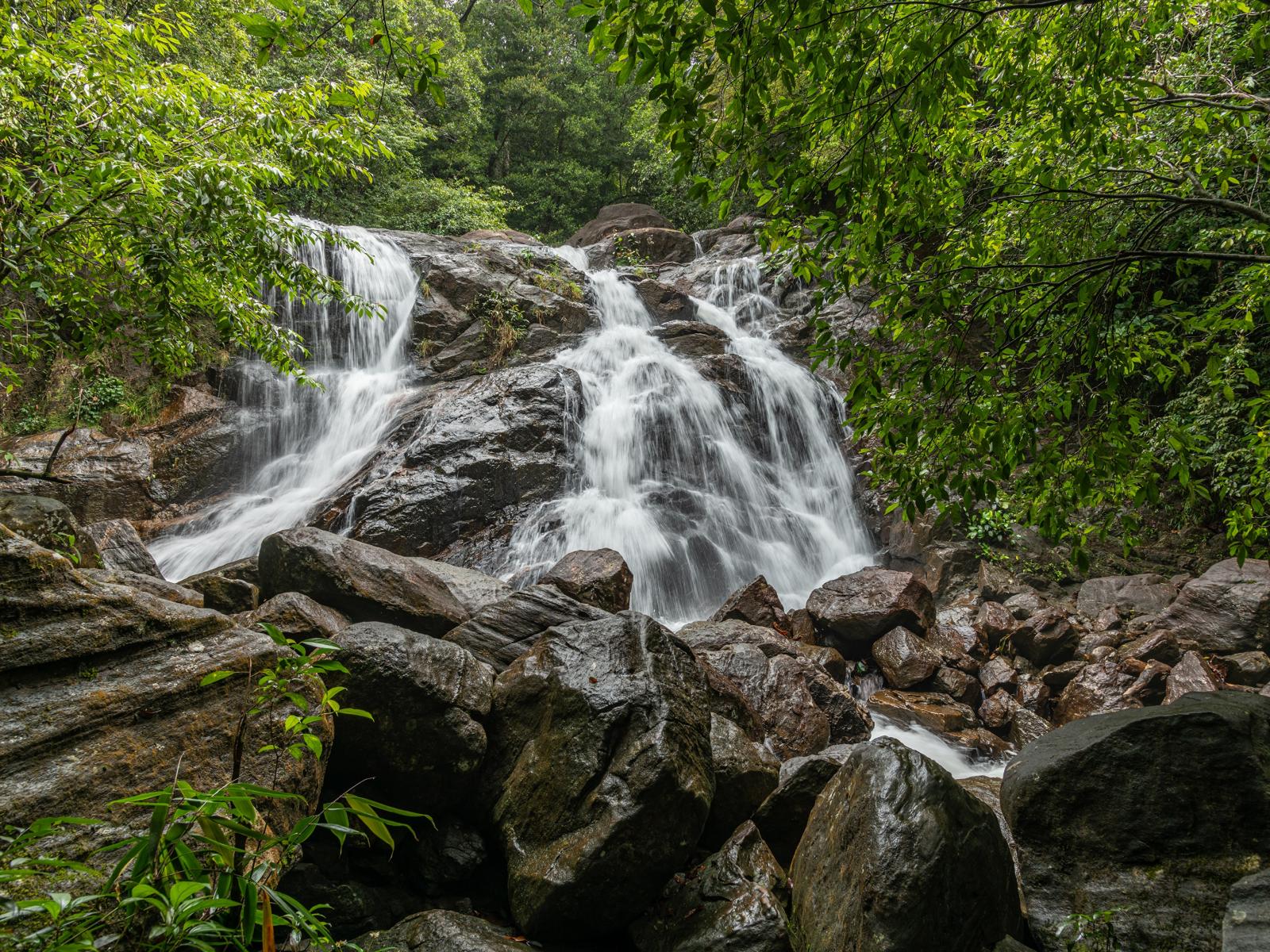 Wallpaper Waterfall flows down large wet stones in the forest.