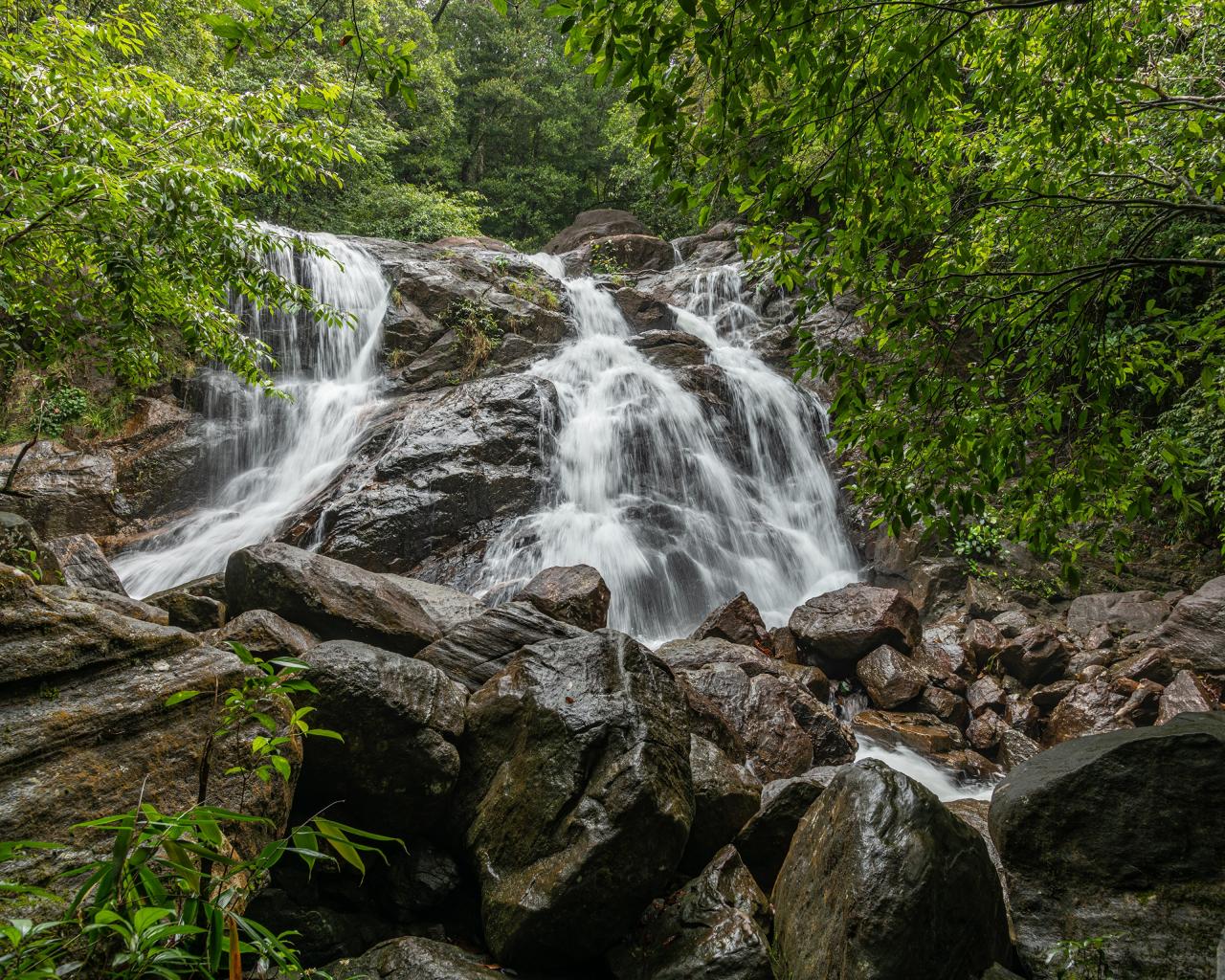 Wallpaper Waterfall flows down large wet stones in the forest.