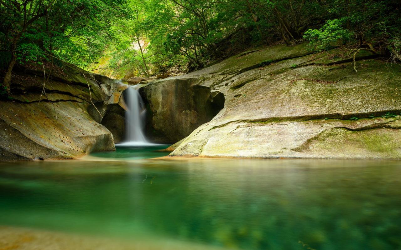 Wallpaper A waterfall flows down a cliff into a lake in a forest