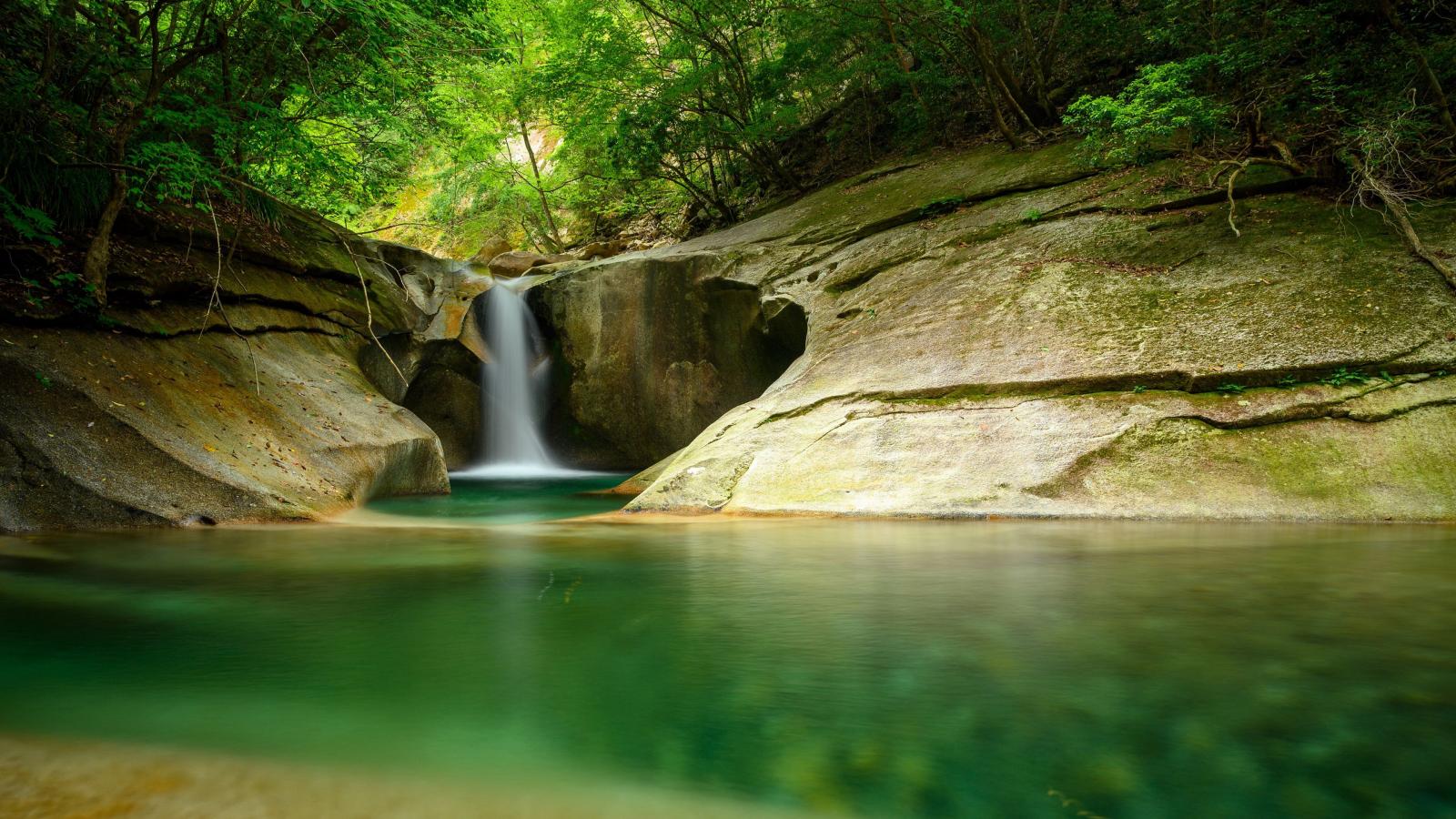 Wallpaper A waterfall flows down a cliff into a lake in a forest