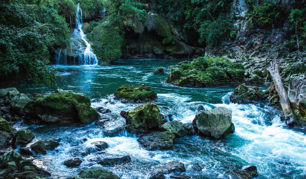 Wallpaper Blue water in a waterfall flows down stones