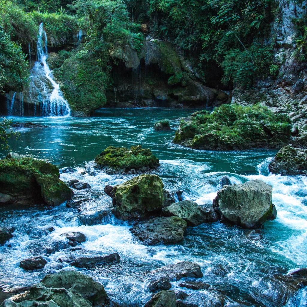Wallpaper Blue water in a waterfall flows down stones