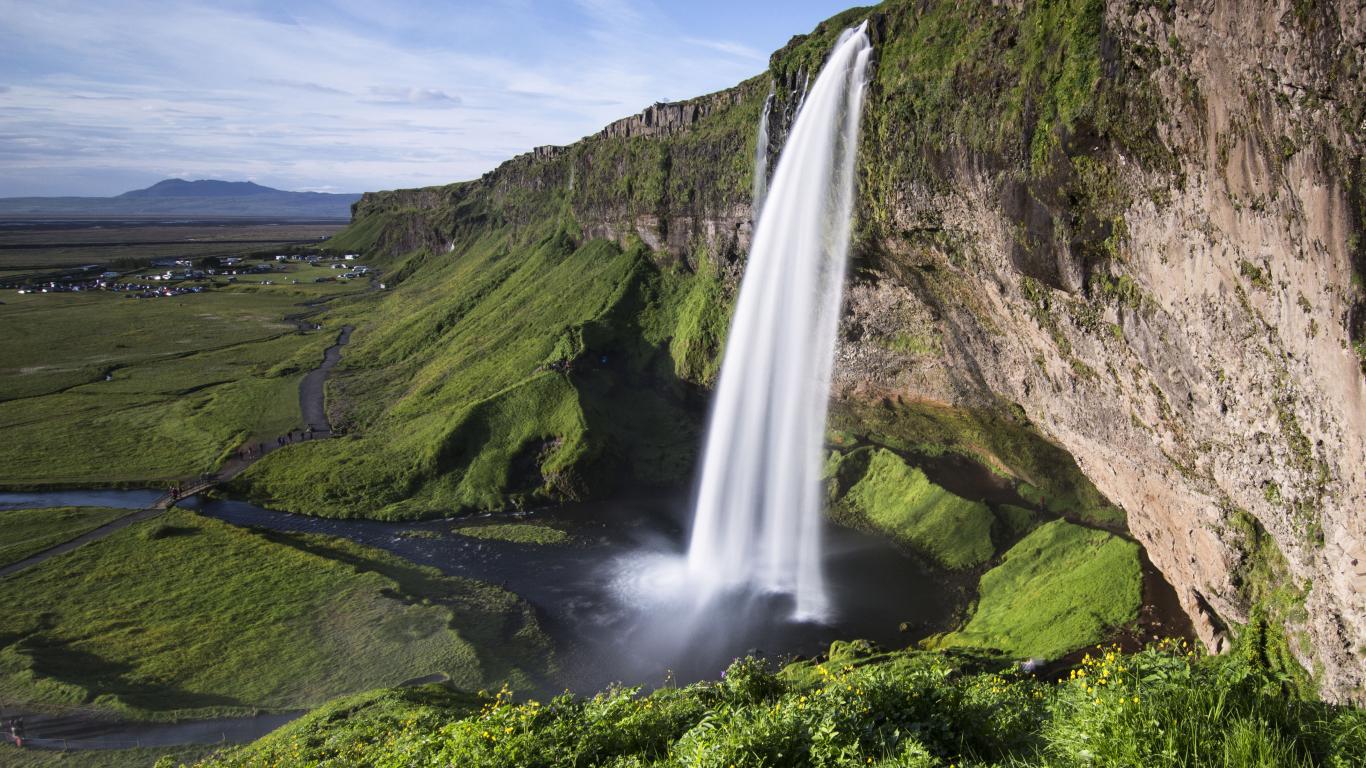 Wallpaper Seljalandsfoss fast waterfall flows down a cliff, Iceland