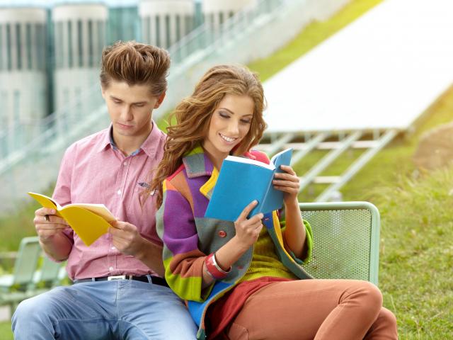 Wallpaper A guy and a girl are reading books sitting on a bench