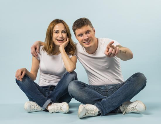 Wallpaper A man and a girl are sitting on the floor against a blue background