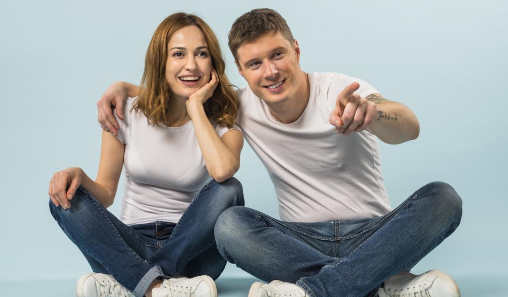 Wallpaper A man and a girl are sitting on the floor against a blue background
