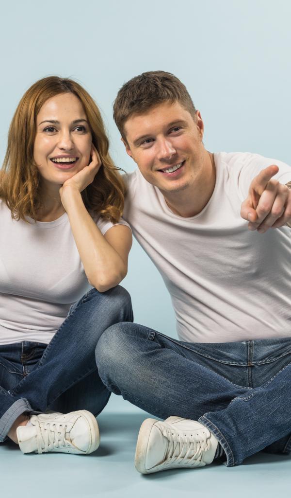 Wallpaper A man and a girl are sitting on the floor against a blue background