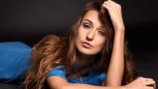 Wallpaper A girl in a red dress lies on the floor with a man in a suit