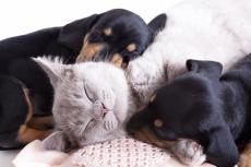Wallpaper A sleeping little boy and a small kitten