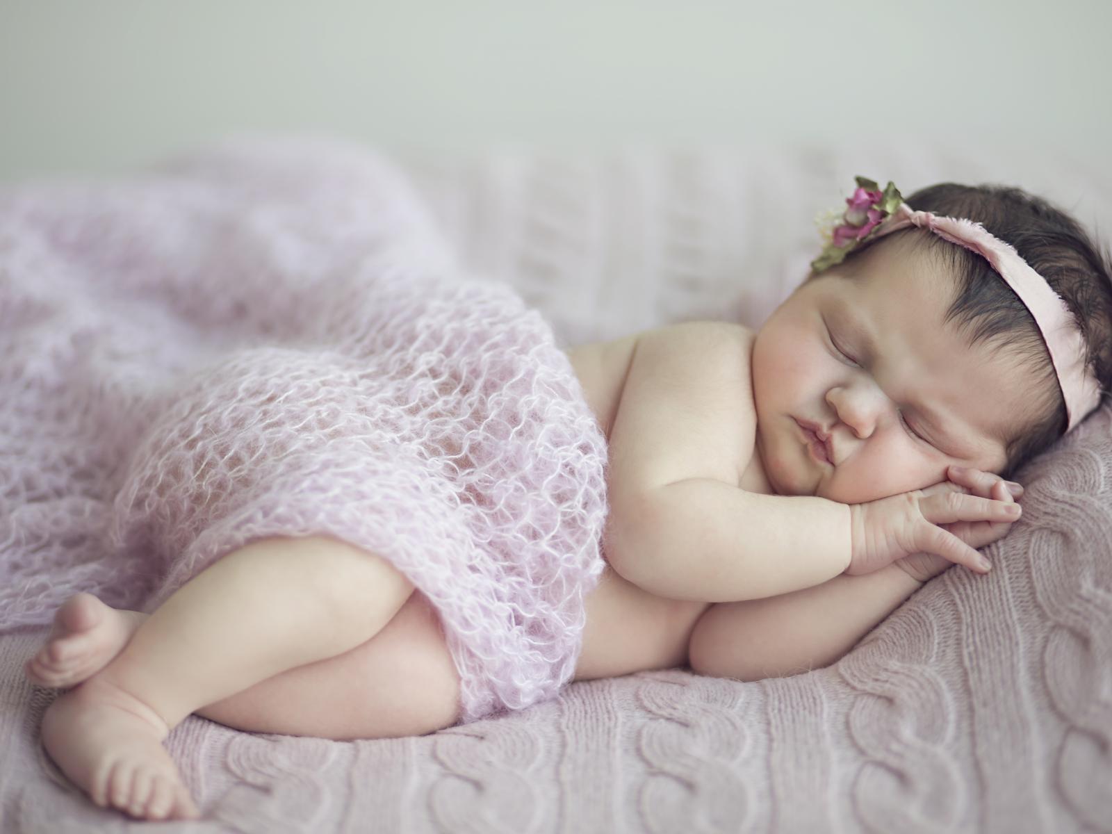 Wallpaper Little baby sleeping under a fur blanket in a knitted hat