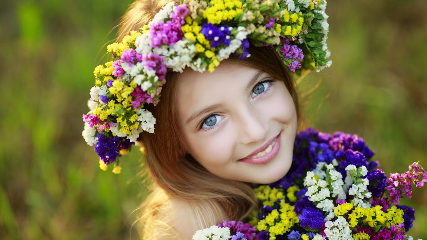 Wallpaper Little blue-eyed girl with wildflowers