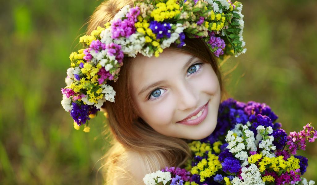 Wallpaper Little blue-eyed girl with wildflowers