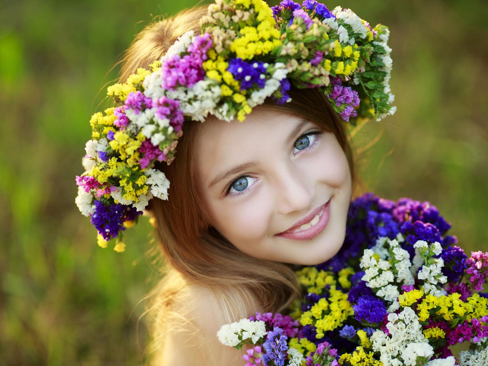 Wallpaper Little blue-eyed girl with wildflowers