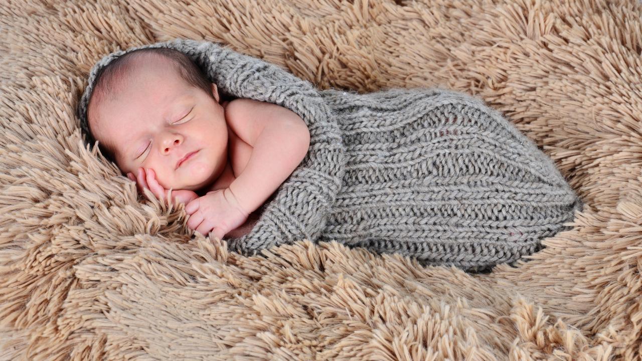 Wallpaper Cute baby sleeping in a little cot on a gray background