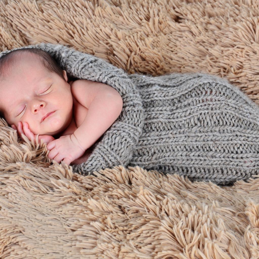Wallpaper Cute baby sleeping in a little cot on a gray background