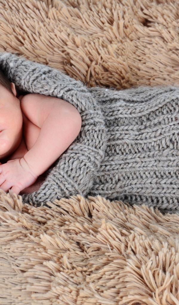 Wallpaper Cute baby sleeping in a little cot on a gray background