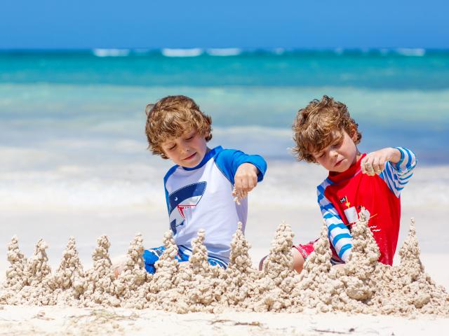 Wallpaper Two little boys playing with sand on the beach