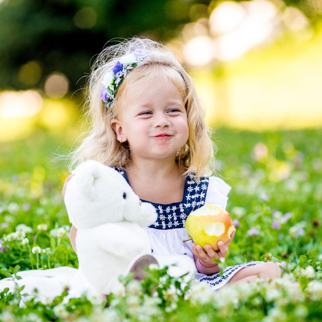 Wallpaper Little girl with a white bear in her hands and a big apple
