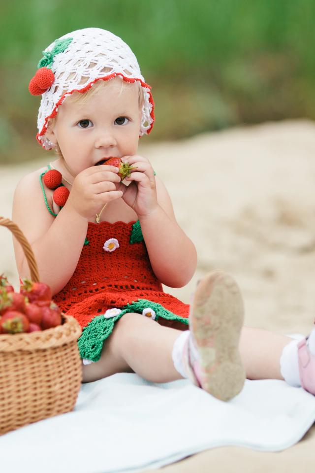 Wallpaper Little girl is sitting with a basket of ripe strawberries