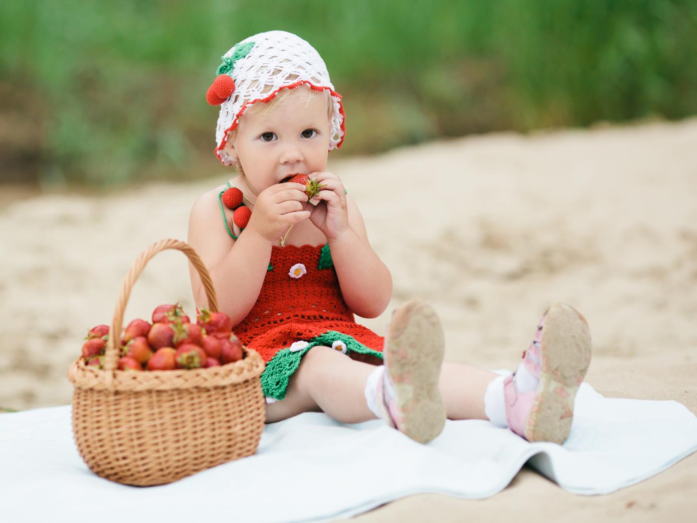 Wallpaper Little girl is sitting with a basket of ripe strawberries