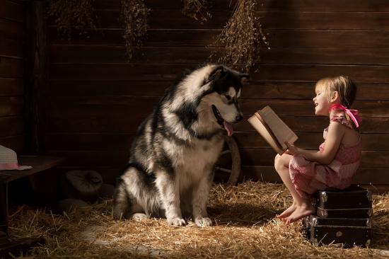 Wallpaper Little girl is reading a book of a dog of the Husky breed