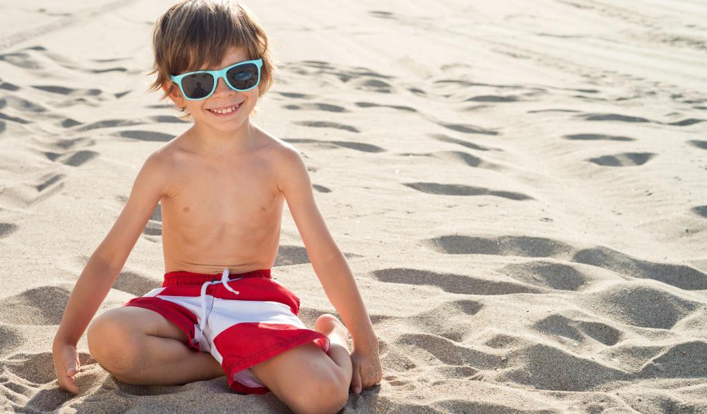 Wallpaper Little boy with glasses sits on the sand on the beach