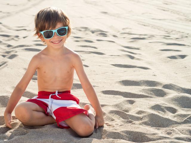 Wallpaper Little boy with glasses sits on the sand on the beach