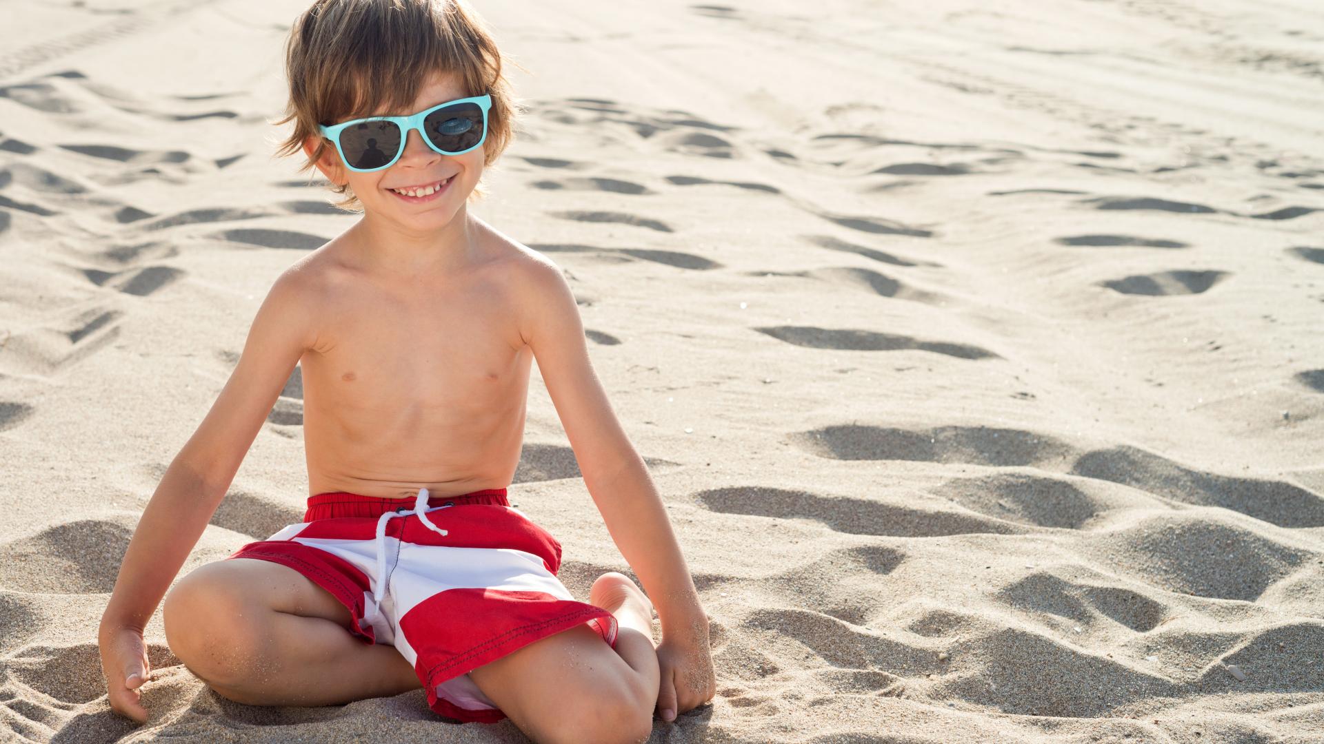 Wallpaper Little boy with glasses sits on the sand on the beach