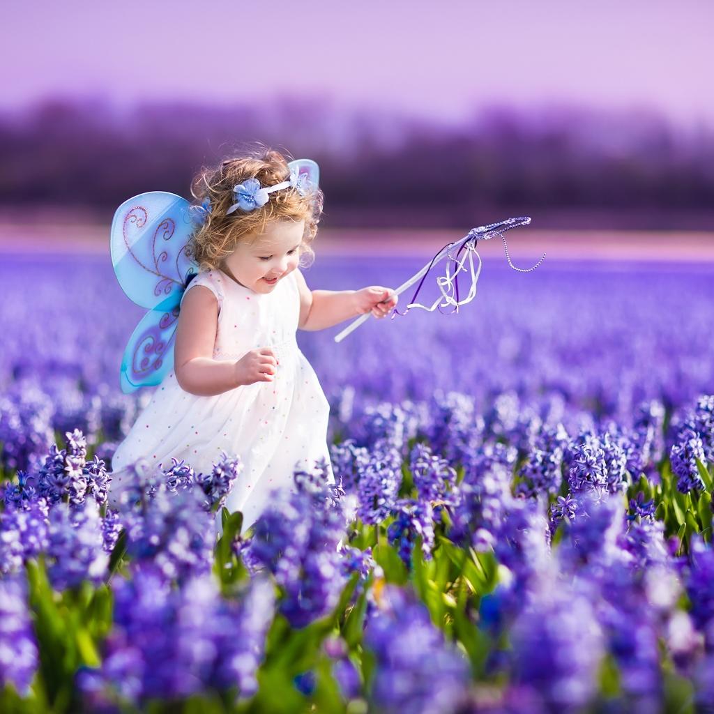 Wallpaper A little girl in a fairy costume walks the hyacinth field