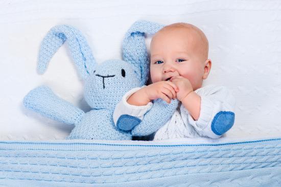 Wallpaper A cute baby lies in a crib with a blue knitted hare