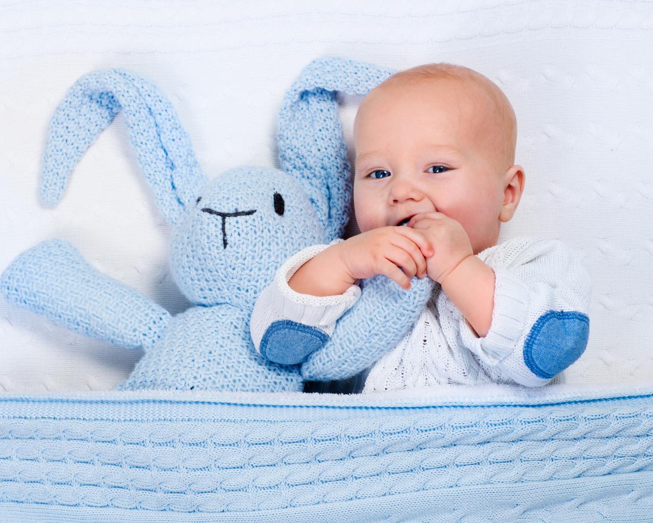 Wallpaper A cute baby lies in a crib with a blue knitted hare