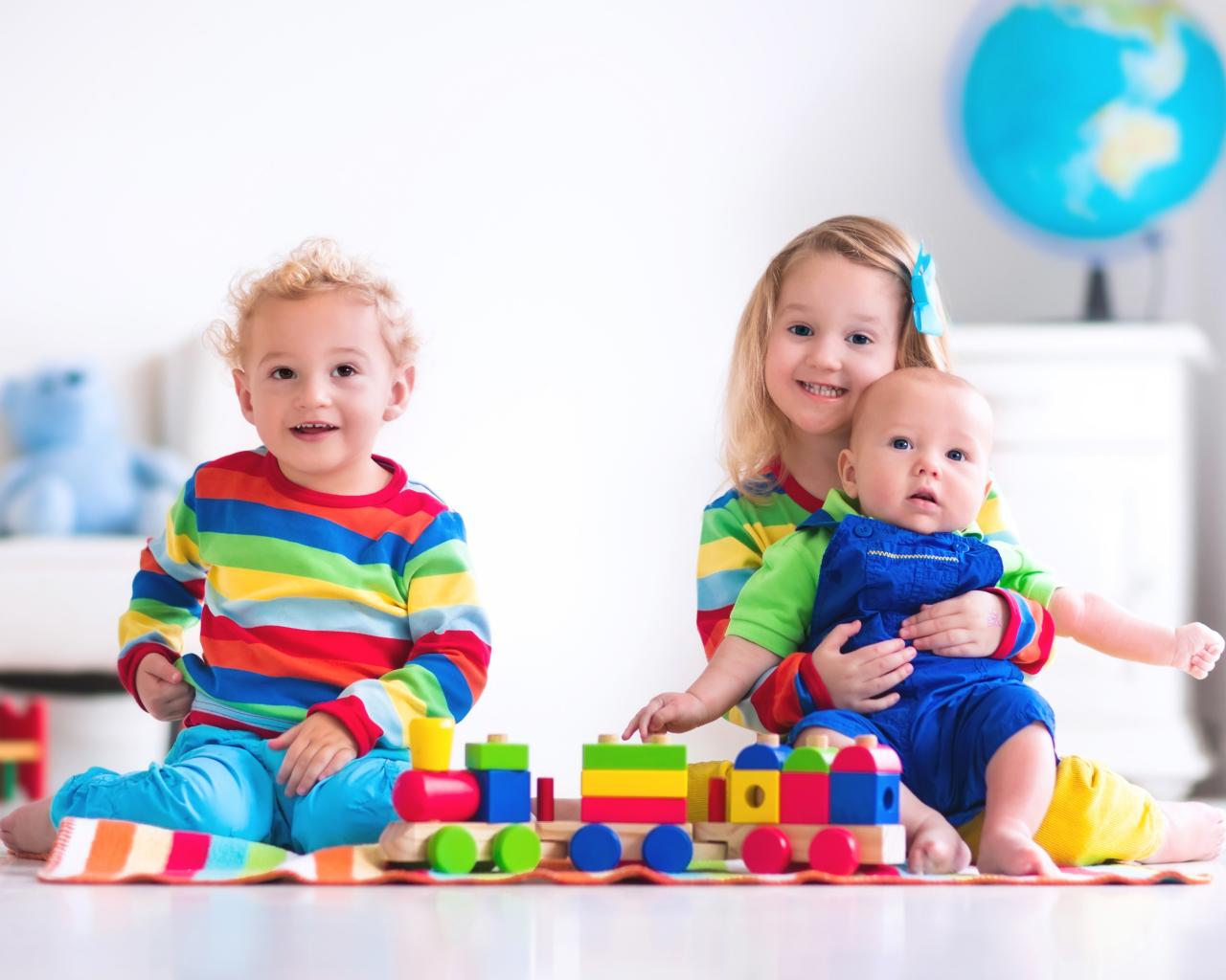 Wallpaper Three children play with a toy train