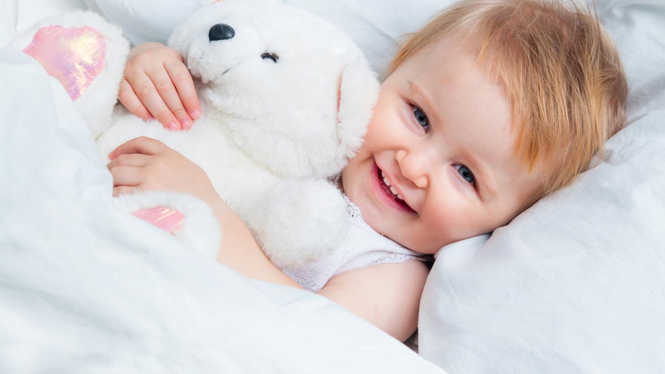 Wallpaper A smiling child lies in bed with a white teddy bear