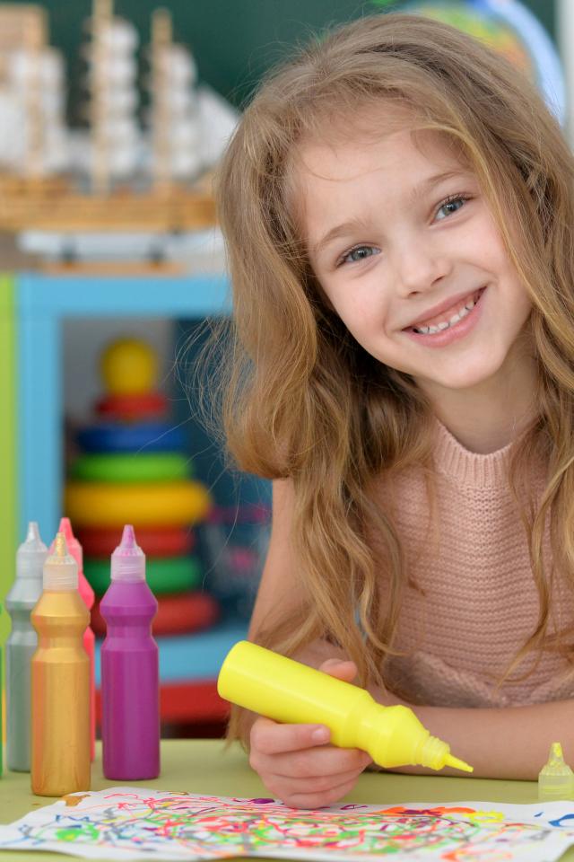 Wallpaper Little smiling girl draws with pencils