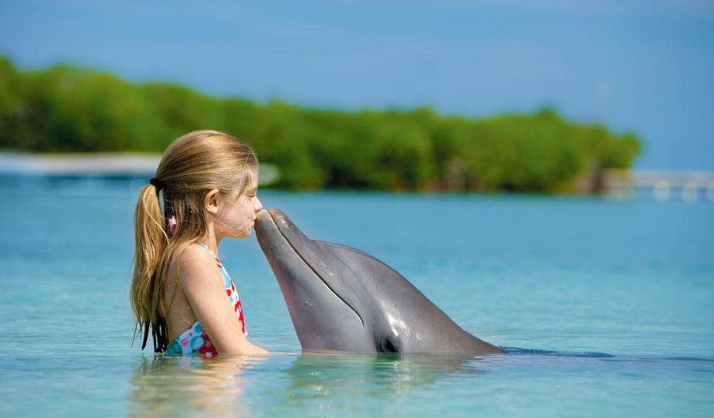 Wallpaper Little girl with a dolphin in blue water