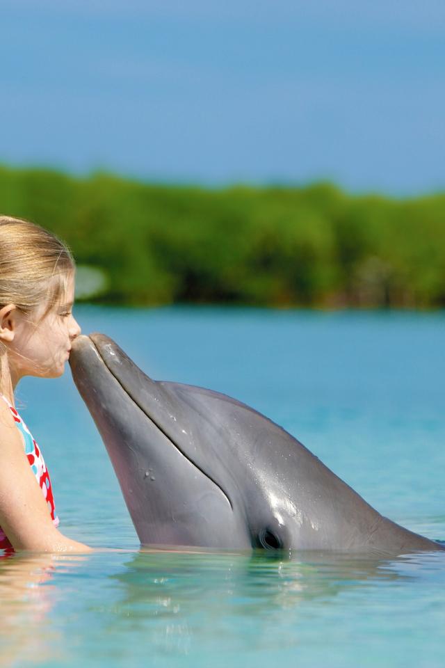 Wallpaper Little girl with a dolphin in blue water