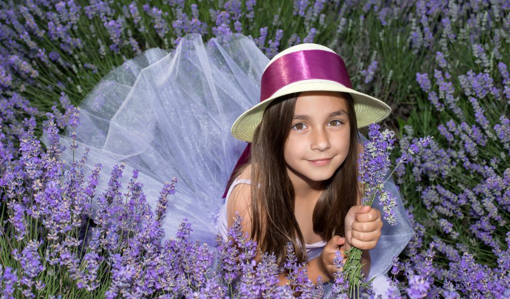Wallpaper A girl in a hat lies in purple lavender flowers