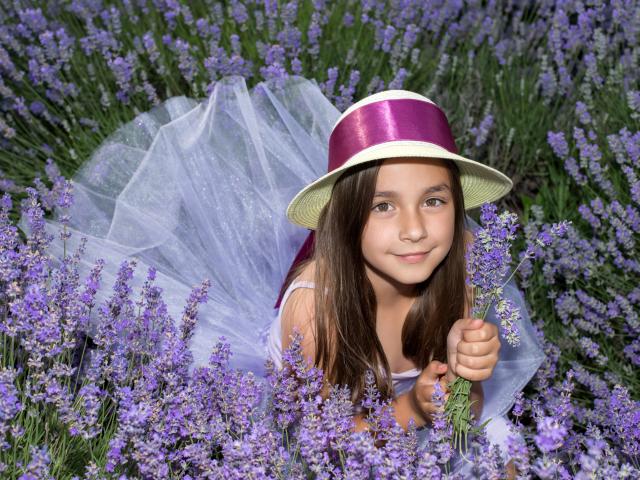 Wallpaper A girl in a hat lies in purple lavender flowers