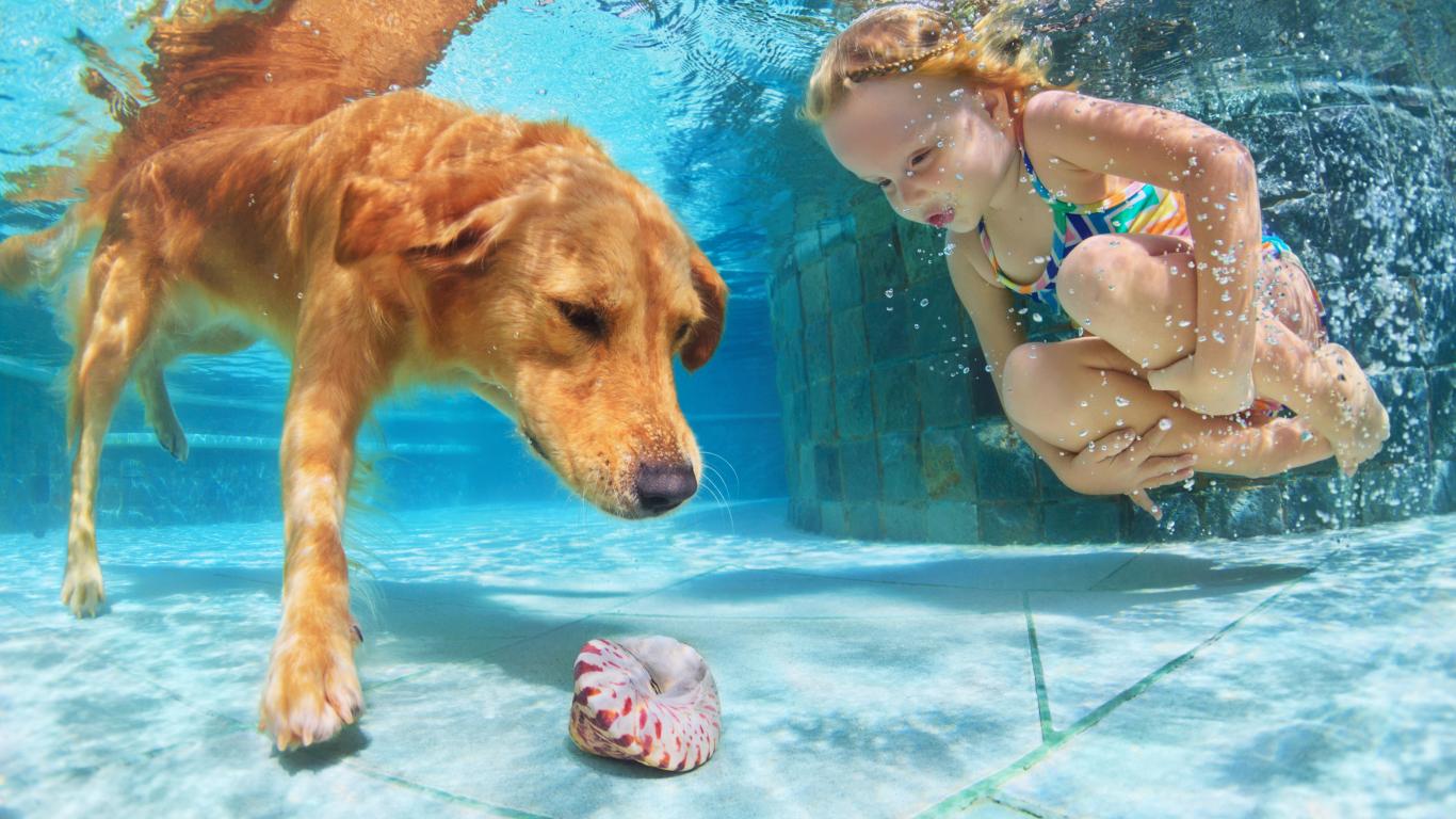 Wallpaper A little girl is swimming in the pool with a big red dog