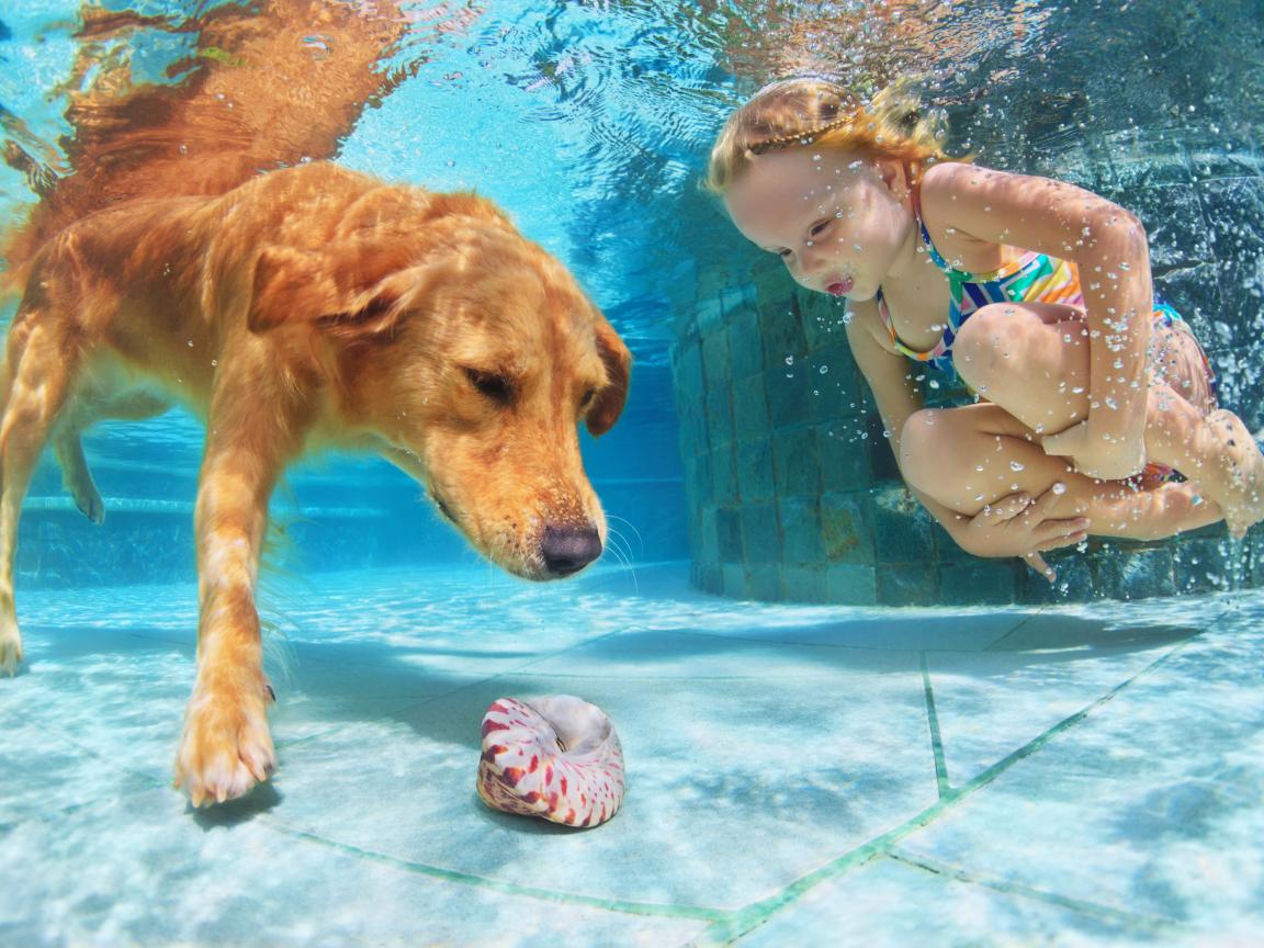 Wallpaper A little girl is swimming in the pool with a big red dog