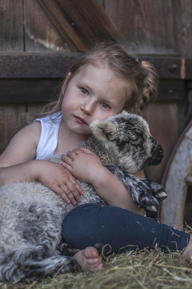 » Wallpaper Little brown-eyed girl hugs a lamb