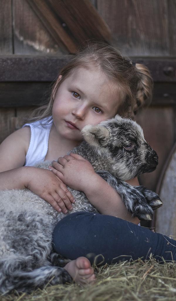 Wallpaper Little brown-eyed girl hugs a lamb