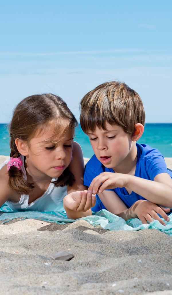 Wallpaper Little boy and girl playing in the sand near the sea