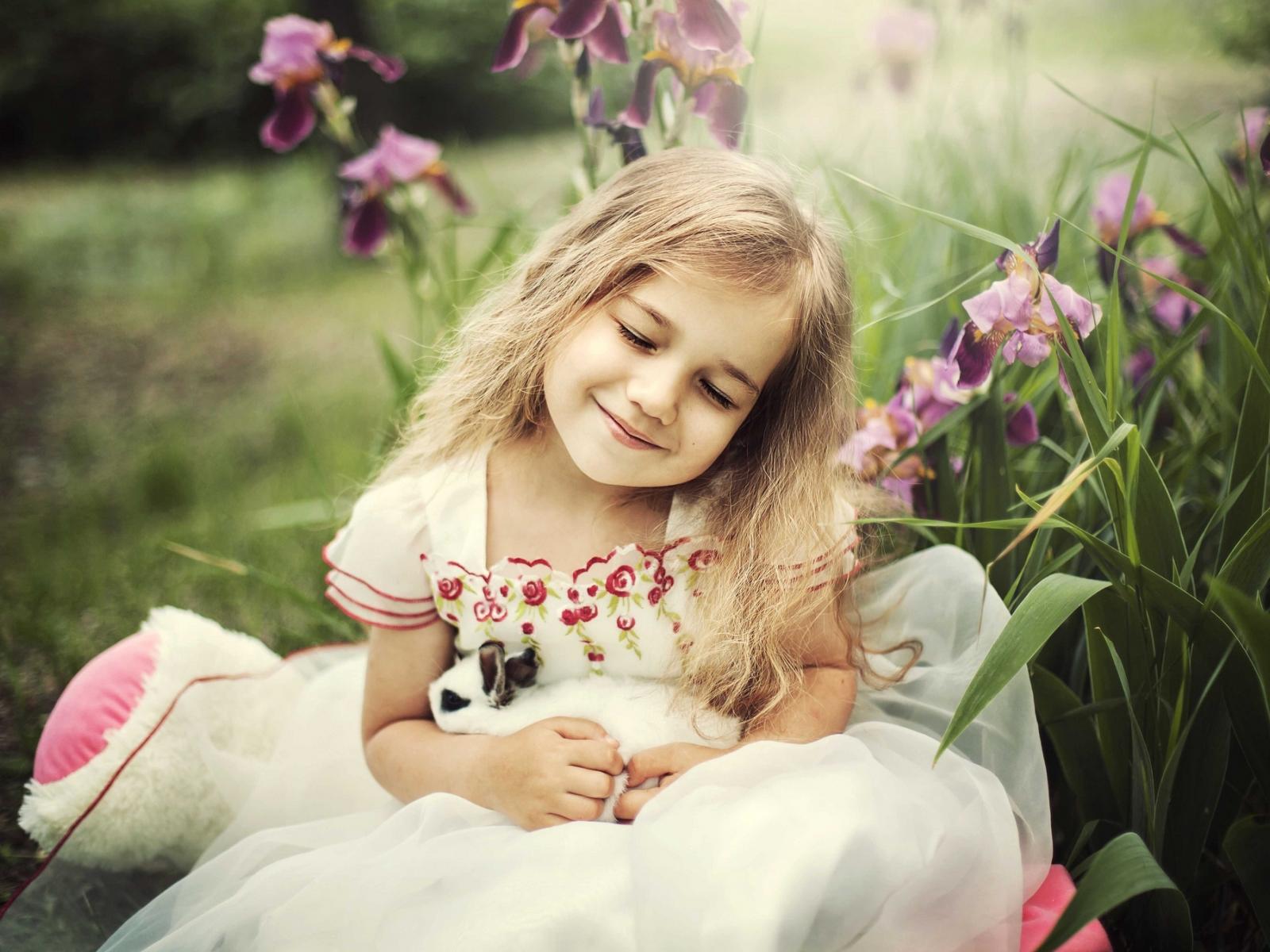 Wallpaper Little blonde girl holding a rabbit in her hands