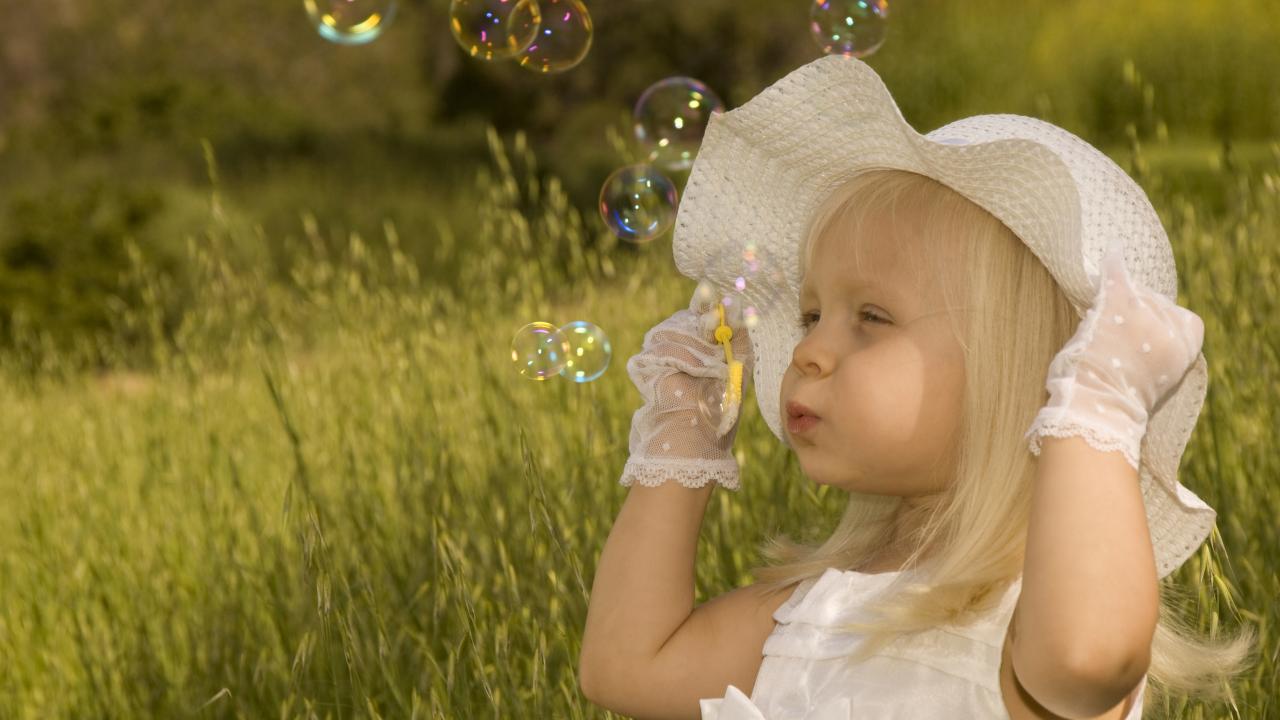 Wallpaper A little girl in a big white hat launches soap bubbles