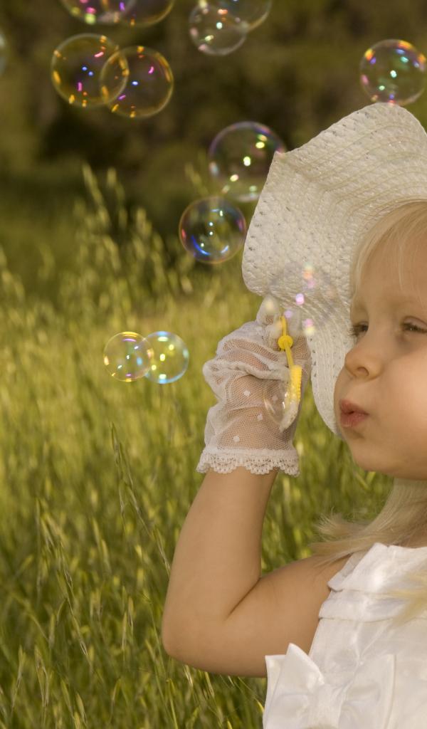 Wallpaper A little girl in a big white hat launches soap bubbles